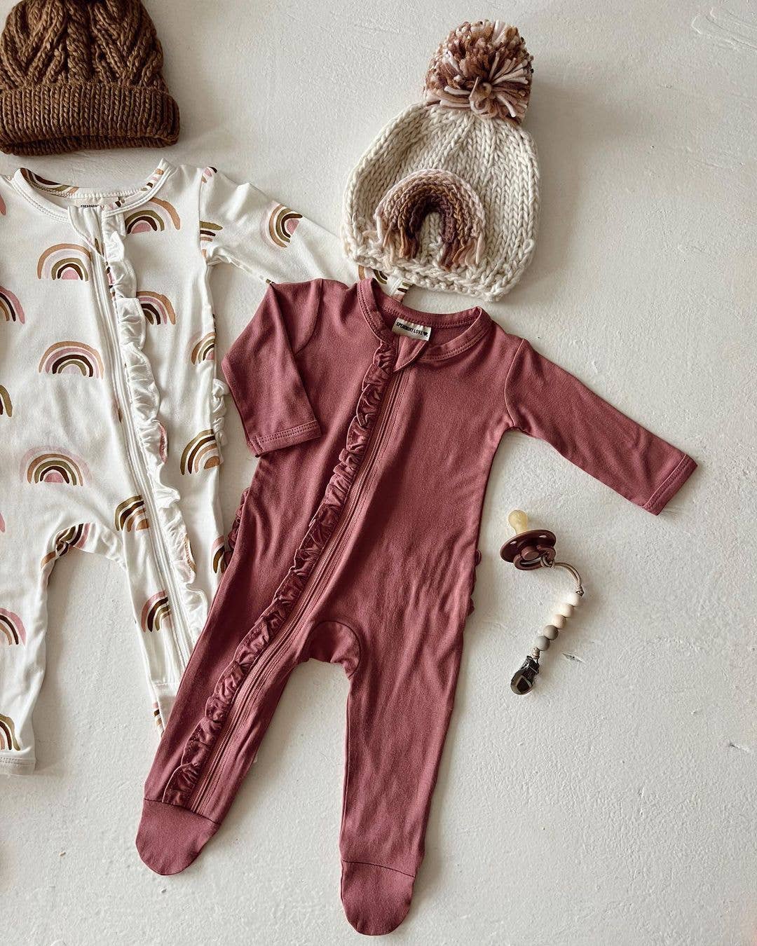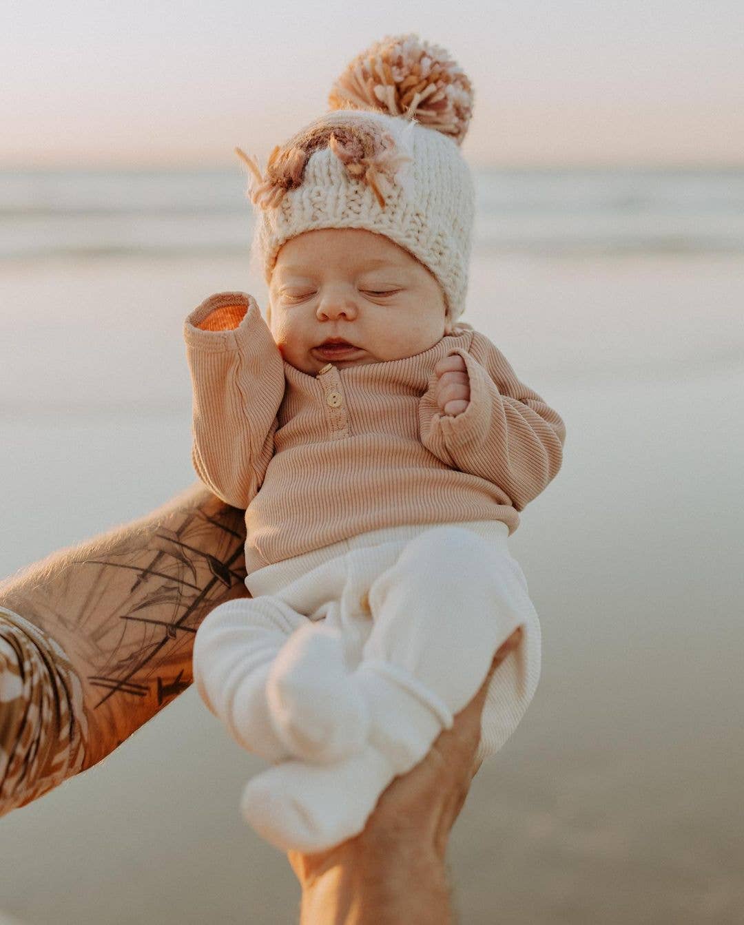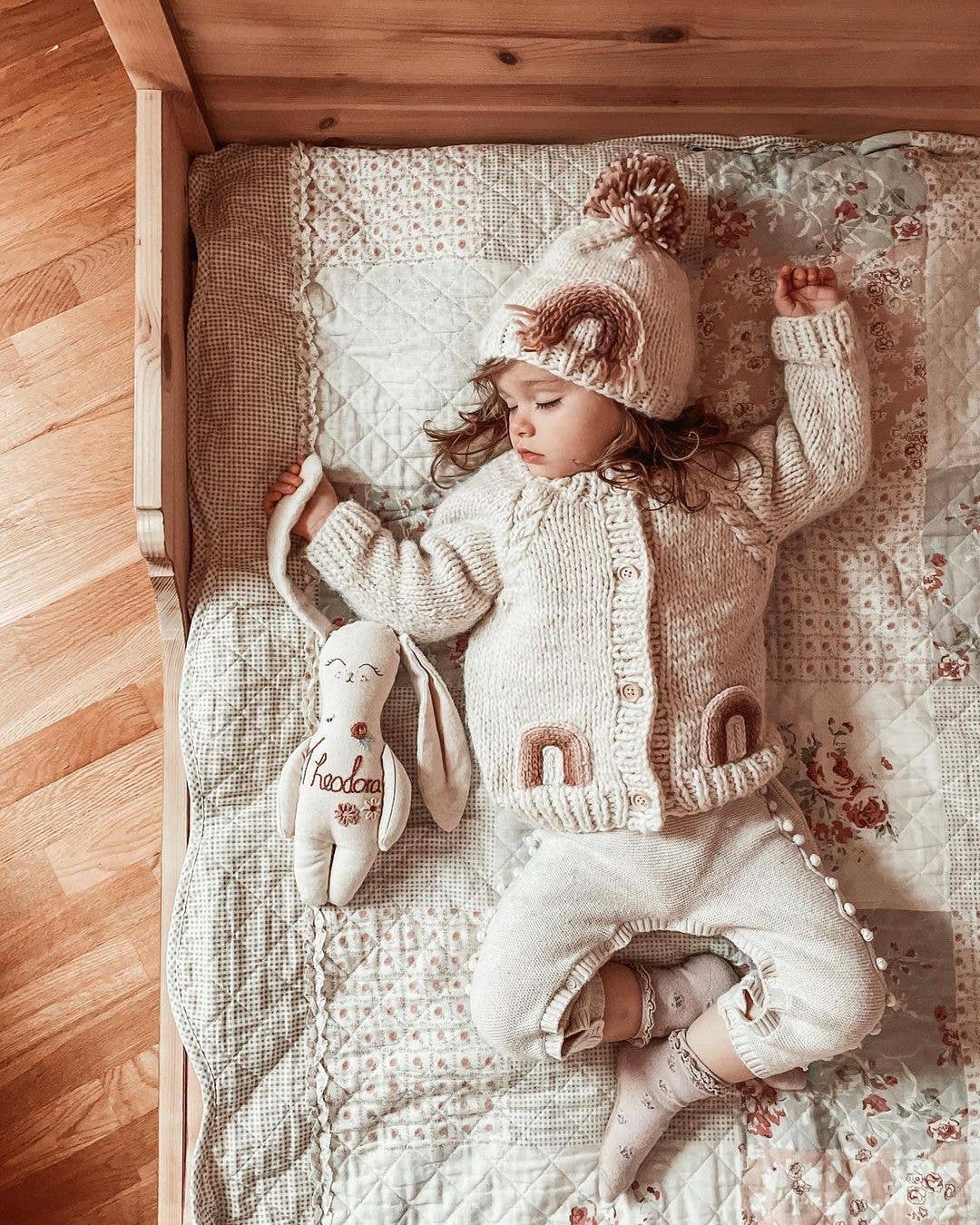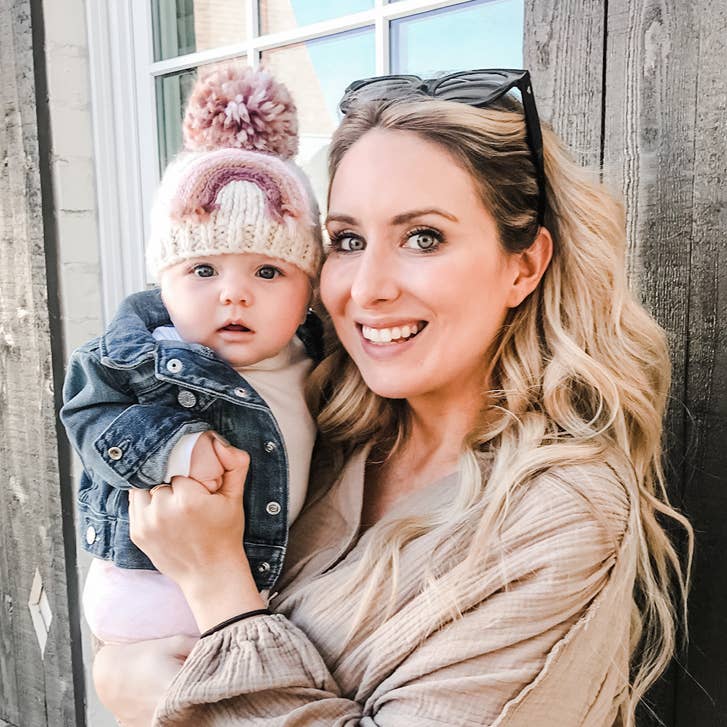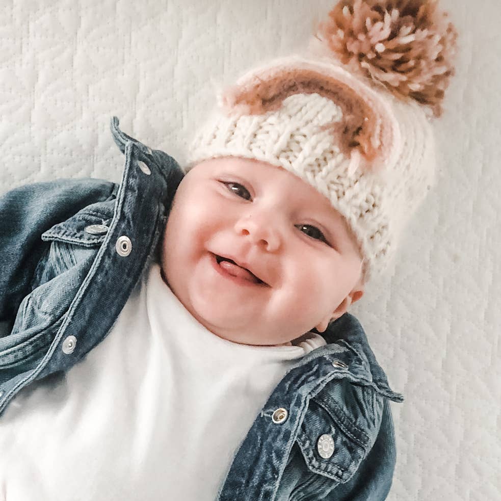 You'll love this beautiful beanie hat in cozy natural colored yarn, adorned with a rainbow in earthy hues of pink and brown. Topped with a pom pom, this looks great with everything.